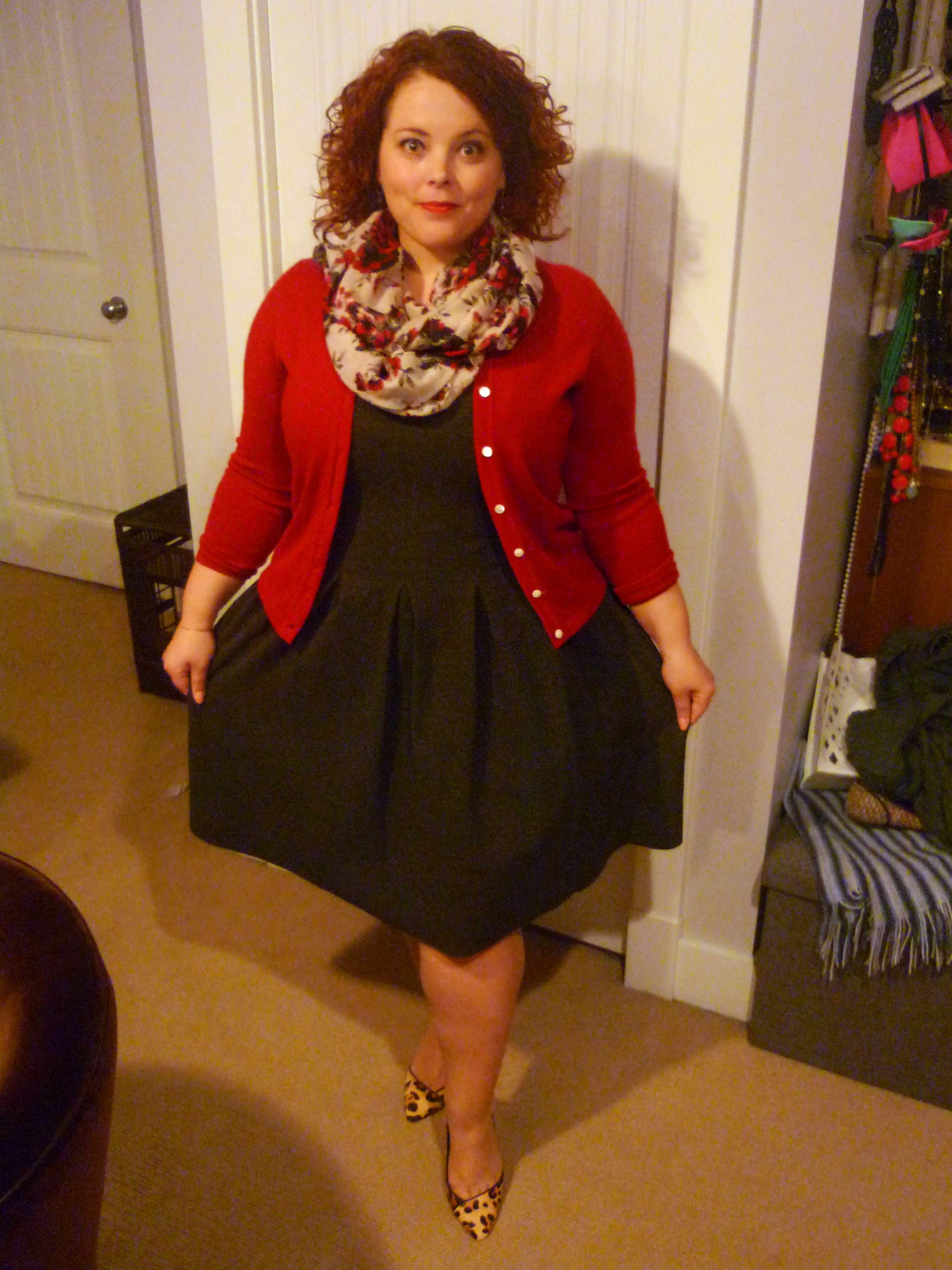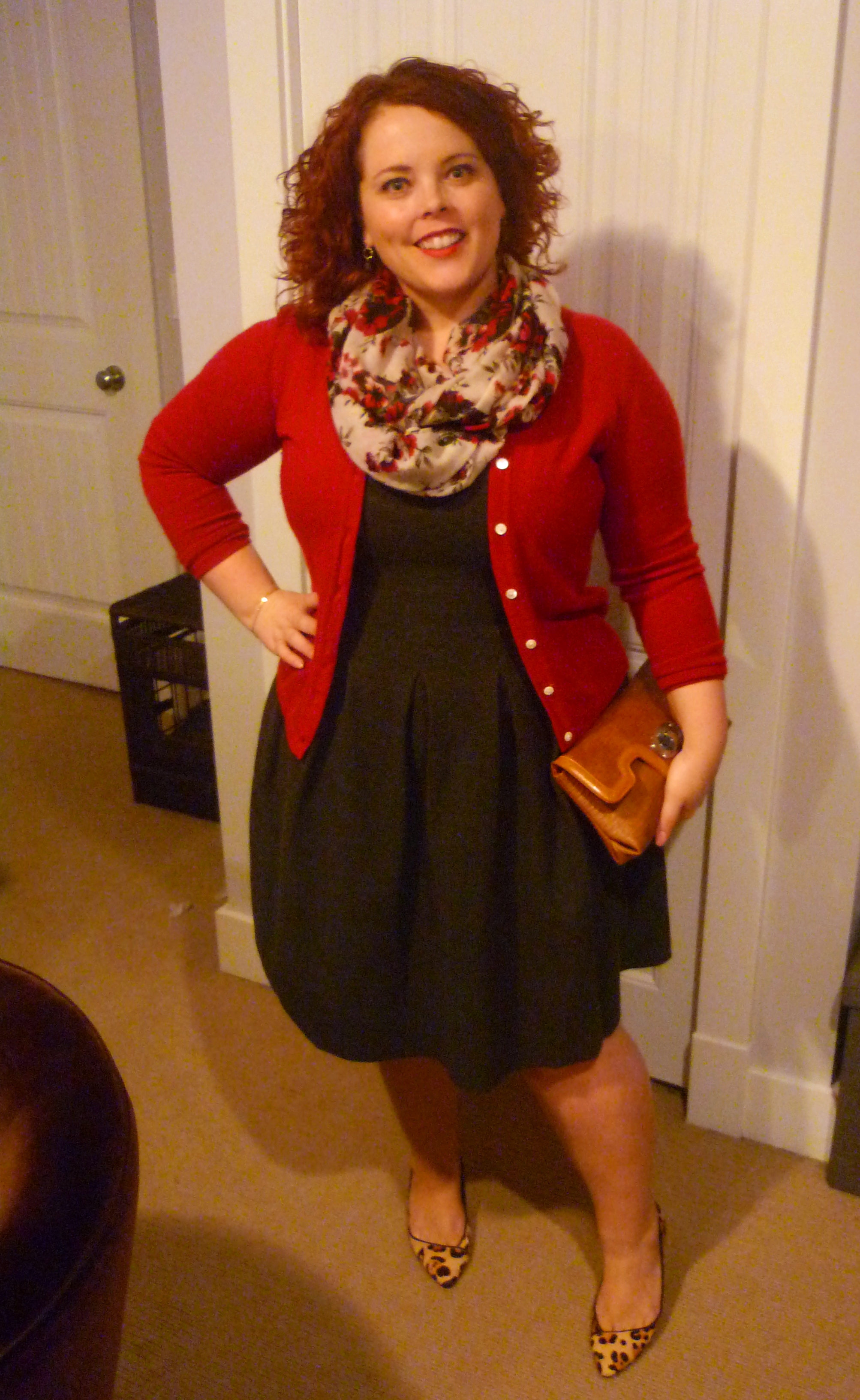 I chose a grey dress to wear because he loves me in that colour. *The pictures are a bit weird because we took them right before dashing out, so there are some shadows that I’m pretending are supposed to be there.* The leopard shoes spice it up a bit, as does the red I think. This dress was on sale at anthropologie, and the shape is great, plus the fabric is unreal. It’s this soft felt-like material but stretchy like a wetsuit. If every dress I own could be this fabric, that would be amazing!