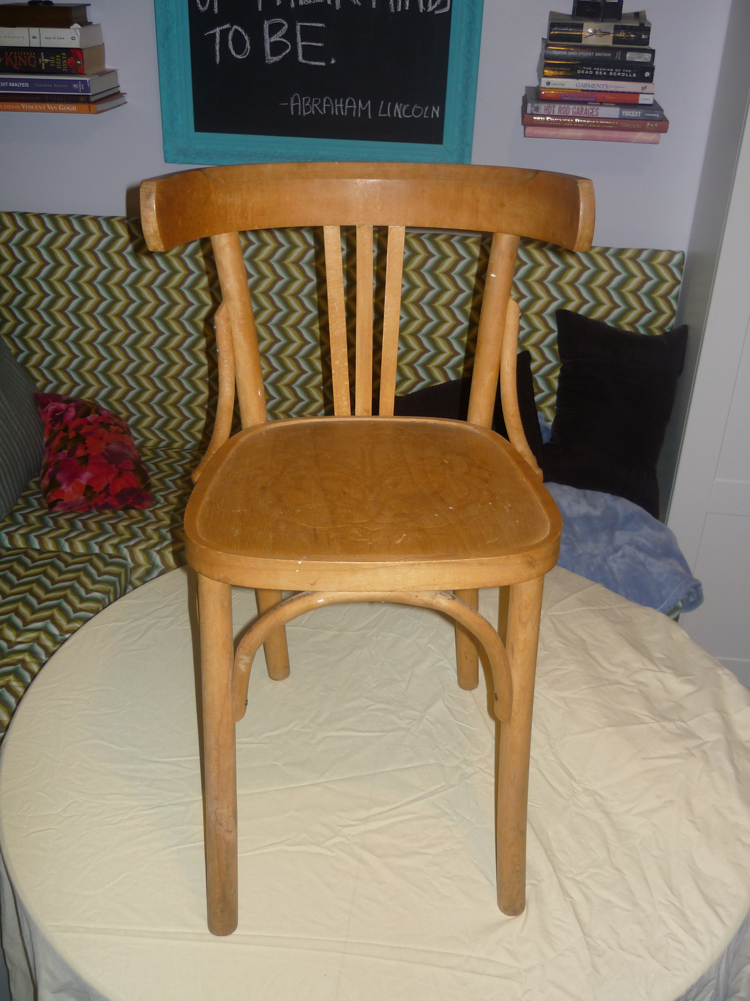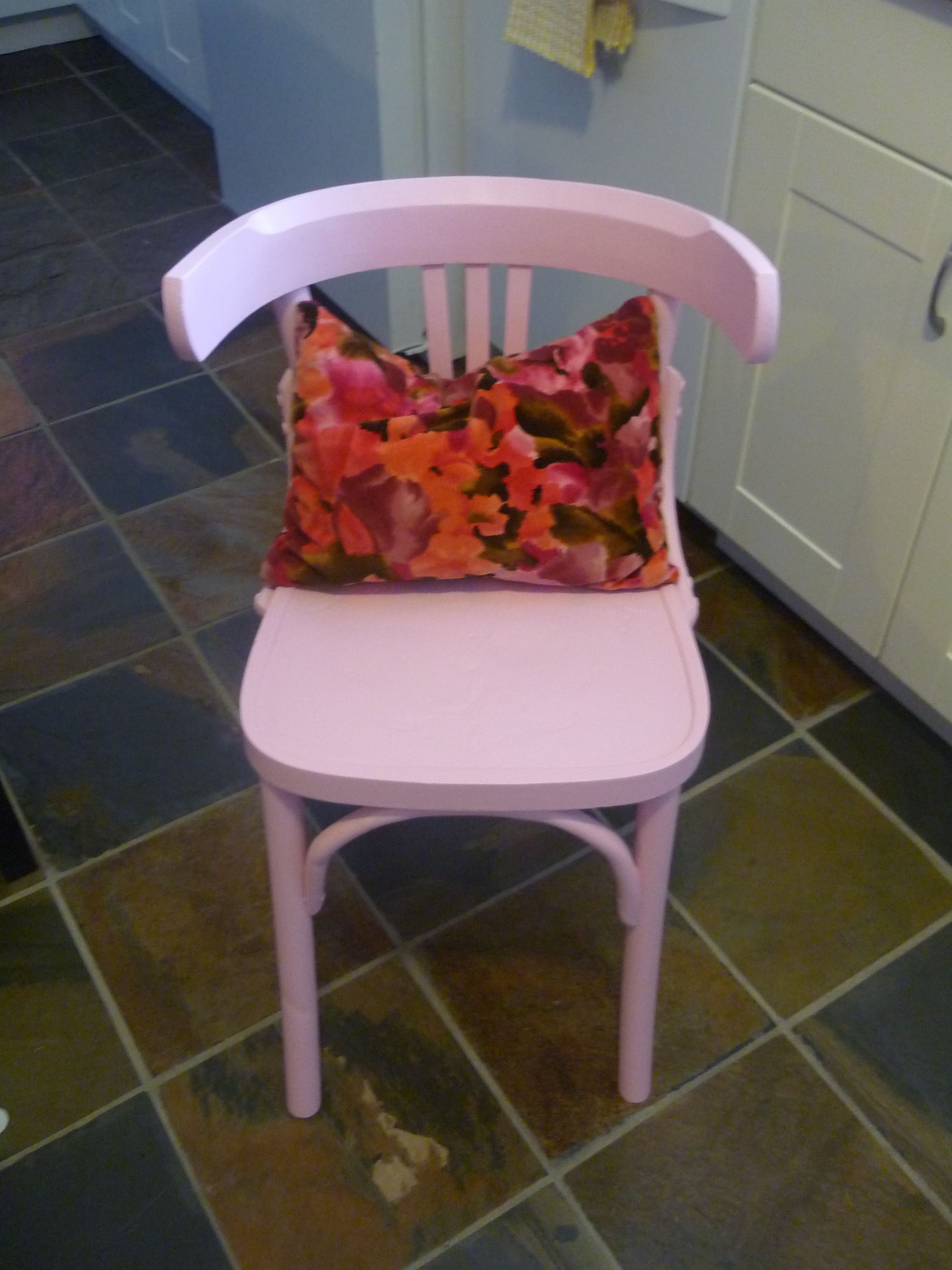 Next, I got a chair for $5.00 at a local thrift store and thought it was kinda blah, so I painted it a pepto-bismol pink. I love how it turned out, and it accents the dining area well.