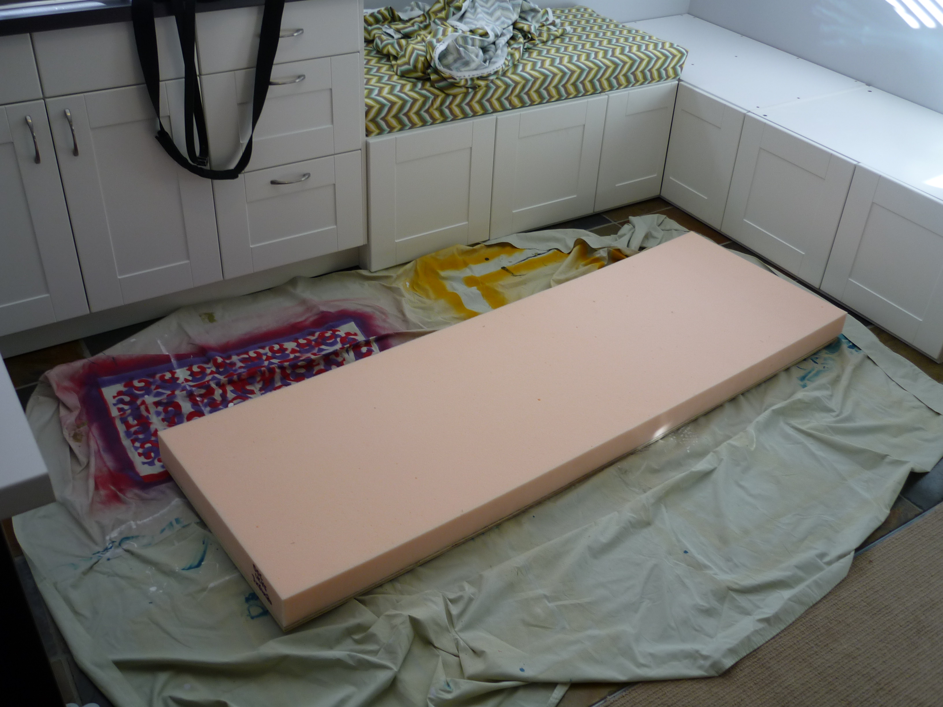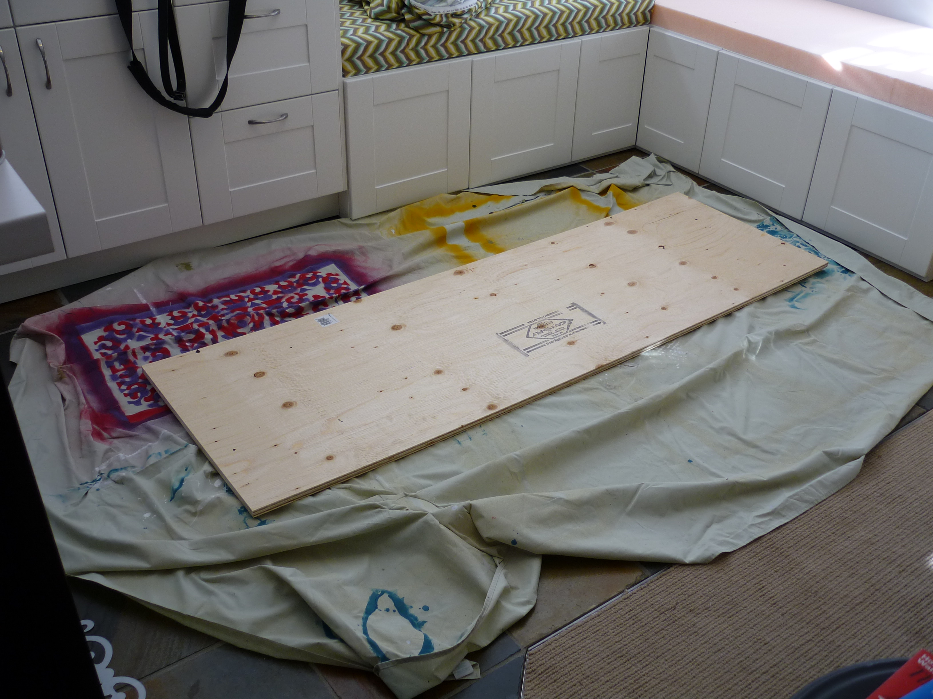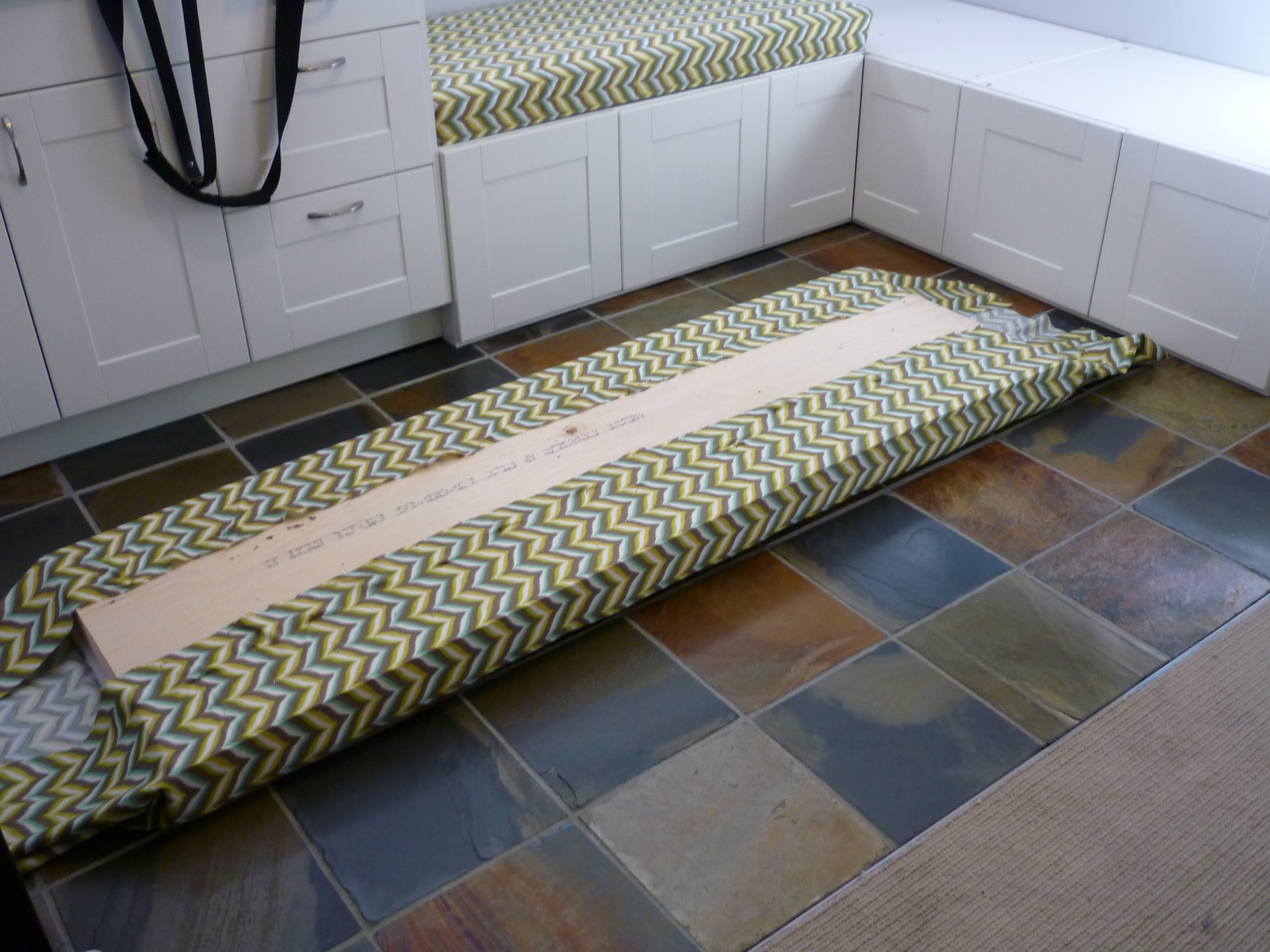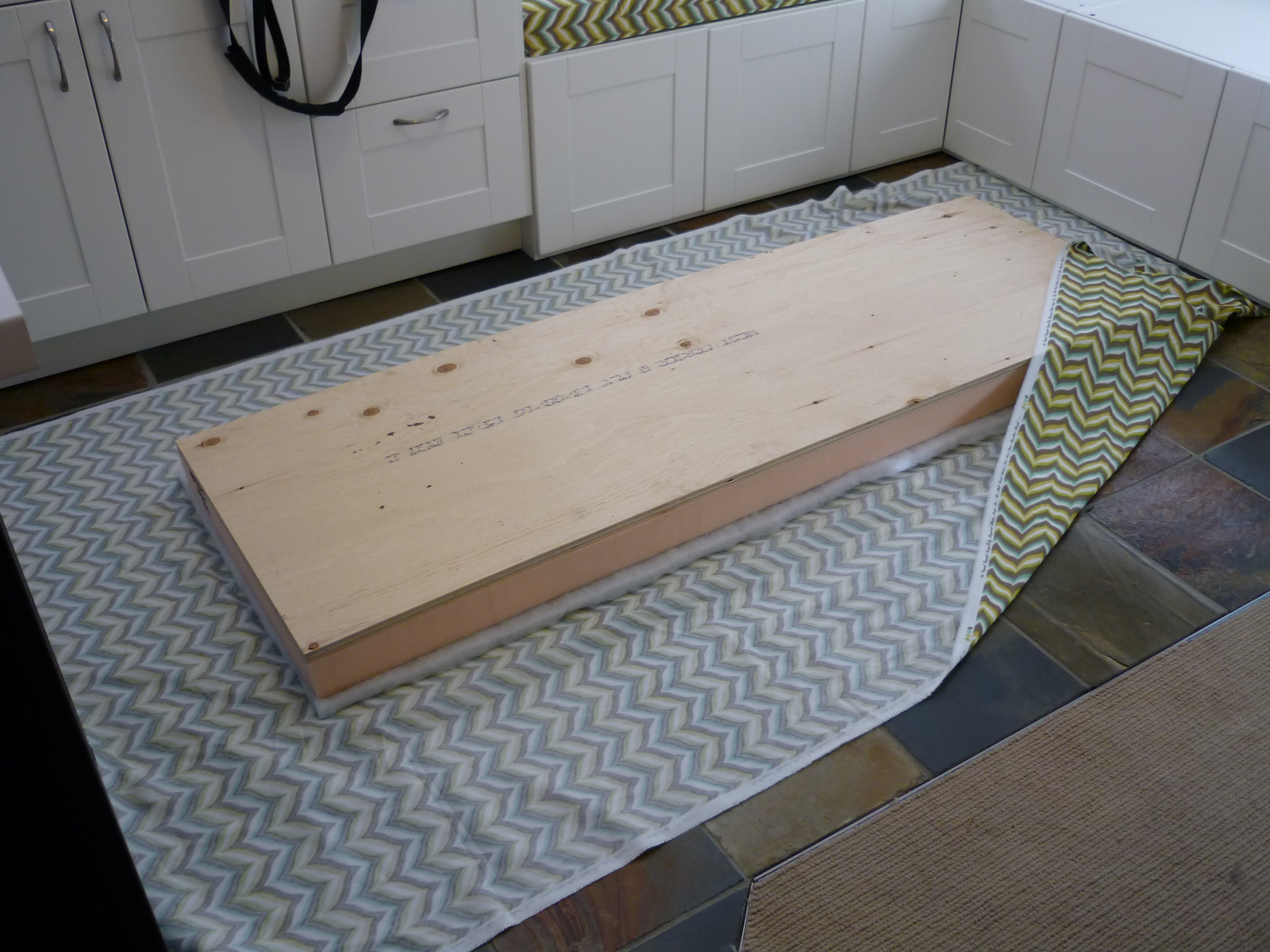 Step one: We got boards cut to the size of the cabinets (see above). This solved two problems: it made the cabinets strong enough to sit on, and meant I didn’t have to pay to get seat cushions made, cuz that would have been pricey!