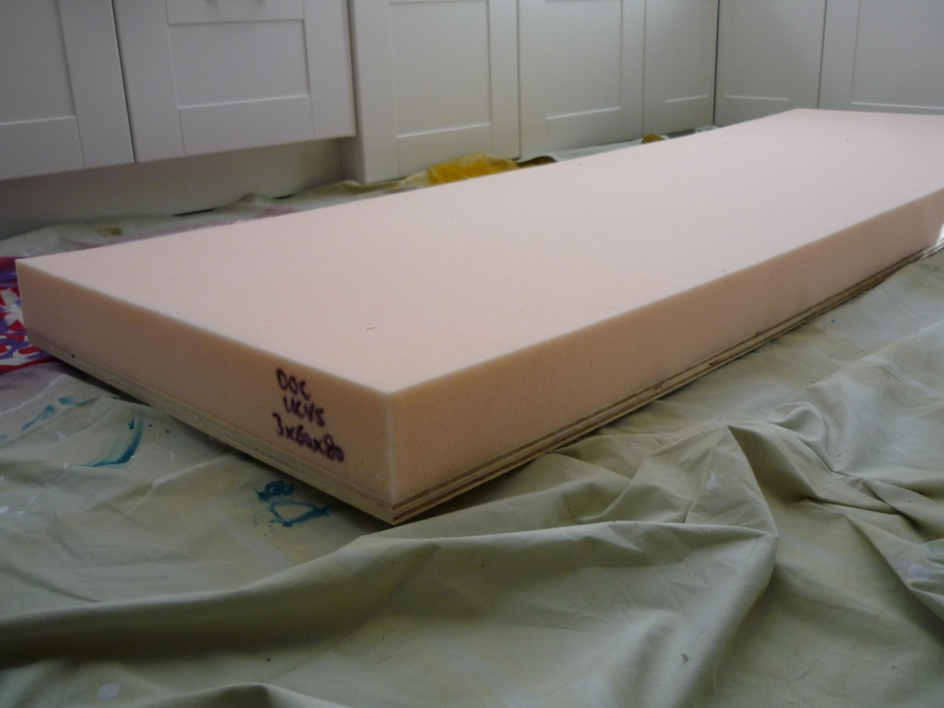 Step two: I got the thickest foam I could, because I wanted the seats to be nice. It turns out I created a problem doing this, but I’ll get to that later. I sprayed the wood with glue and put on the foam, carefully.