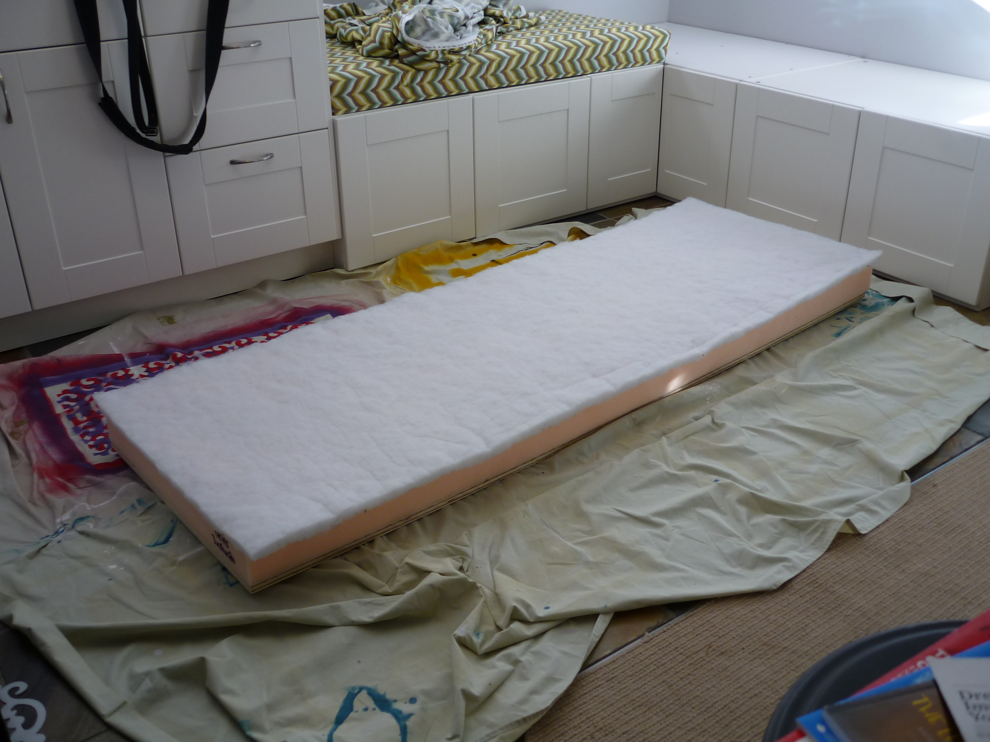 Step three: I bought batting along with the foam at the foam shop, and the guy there told me not to make the batting too long: it should look just like this, barely going over the foam. This way, you get crisp lines at the bottom. Smart, right? I spray glued the batting onto the foam, after I had cut it to size.