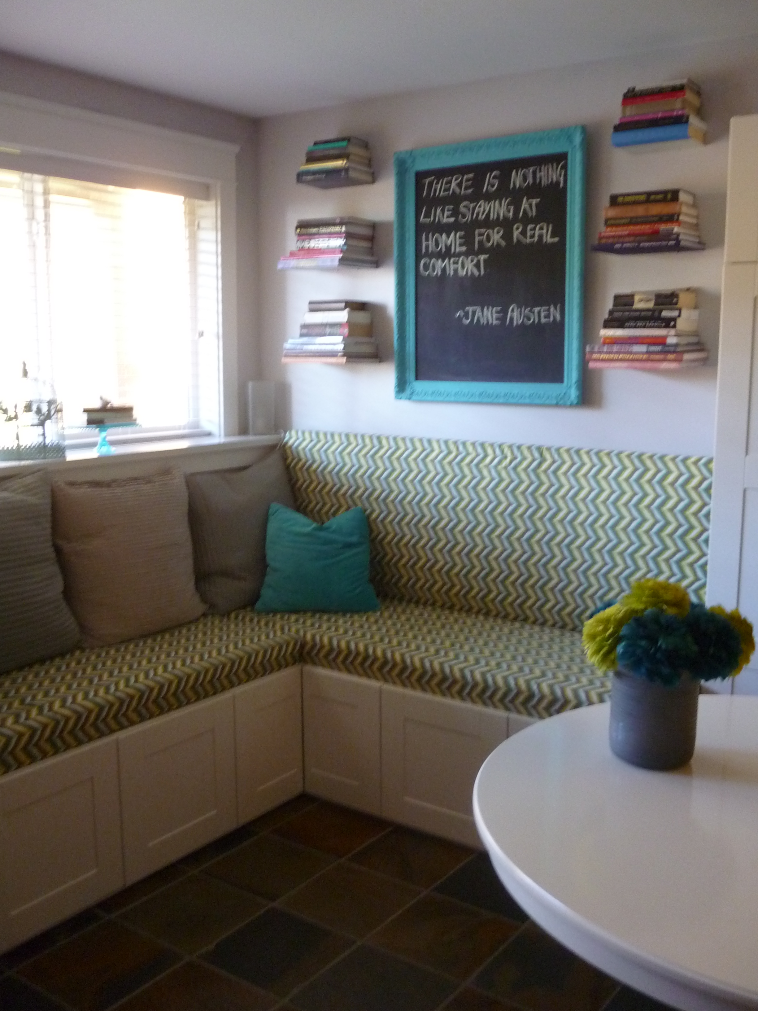 Now here was the problem: We have cabinets, then wood pieces, then 3 inch foam and that made the seats very high. Too high for the table, in fact. If we left it like this, we would have put our backs out leaning down to eat! So my clever husband decided to put wheels on the table legs, which you can see in the very last picture. This had two benefits: it made the table the correct height for eating, and it made the cabinetry underneath a lot more accessible. My sewing machine, slow cooker, and extra water is down there among other things, so we need to access the cabinets fairly often. The wheels can be locked as well when we don’t want the table moving. Now we have an adorable and functional space!