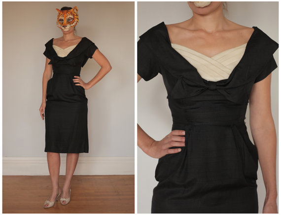 This one is from Animal Head Vintage on etsy. Can you believe this shelf bust and bow? They don’t even make dresses like this one anymore! The shape is heavenly, and the black and white! Swoon.