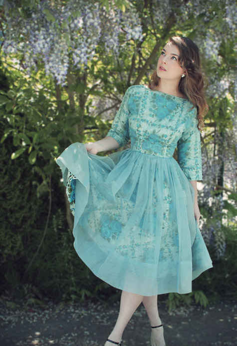 Ok seriously, what’s not to like? The pattern underneath is muted by the organza on top, and the result is pure 50s perfection! Modeled by the lovely Angela, this dress is available still in my etsy shop.