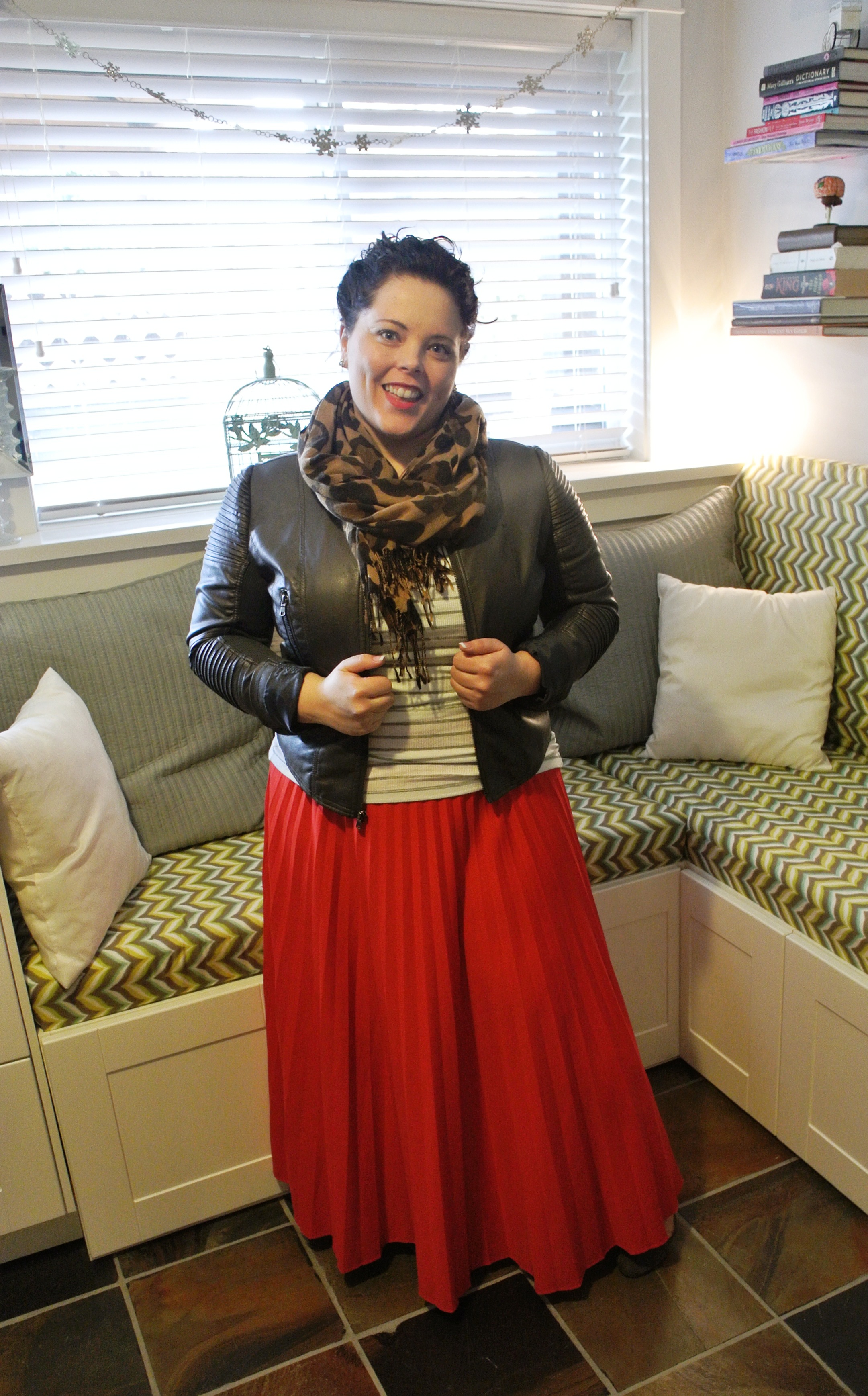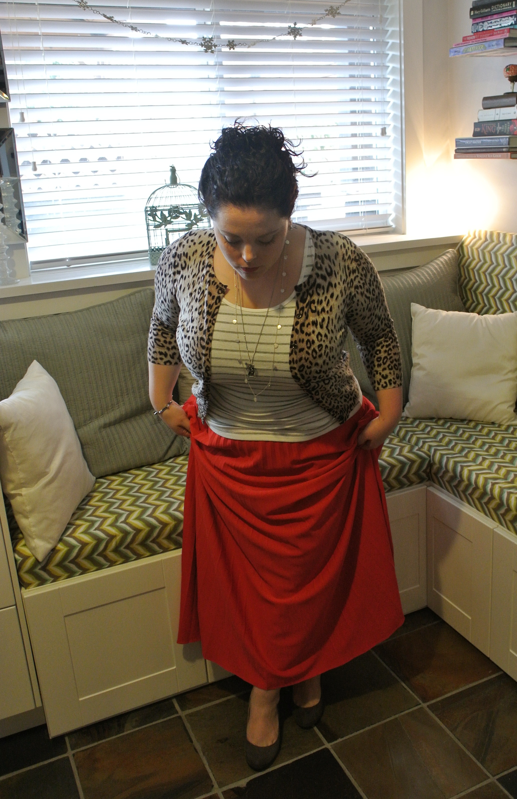 Gray jacket: Le Chateau/ Tank top: Gap factory/ Leopard Cardi: Winners/ Scarf: Thrifted/ Necklaces: Stella and Dot, Little White House/ Bracelet: Zulily/ Skirt: Goodwill/ Wedges: Consignment