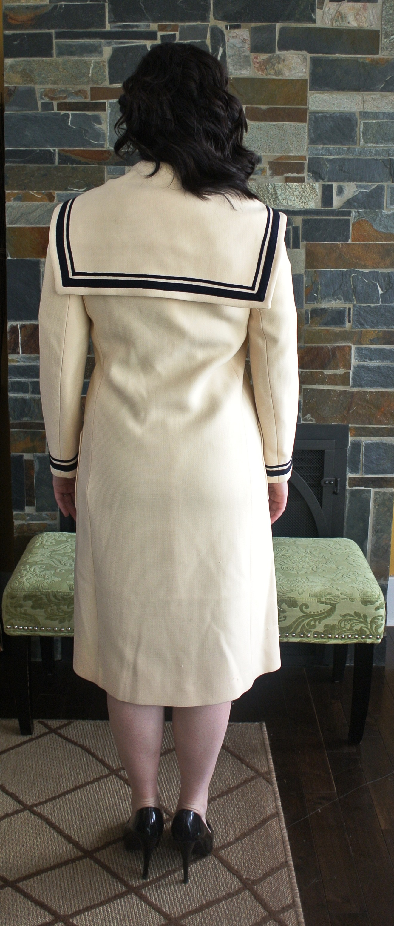This is an amazing find!  Just under knee-length cream sailor coat with navy trim at the collar and wrists.  The coat is solidly constructed, 60s does 20s.