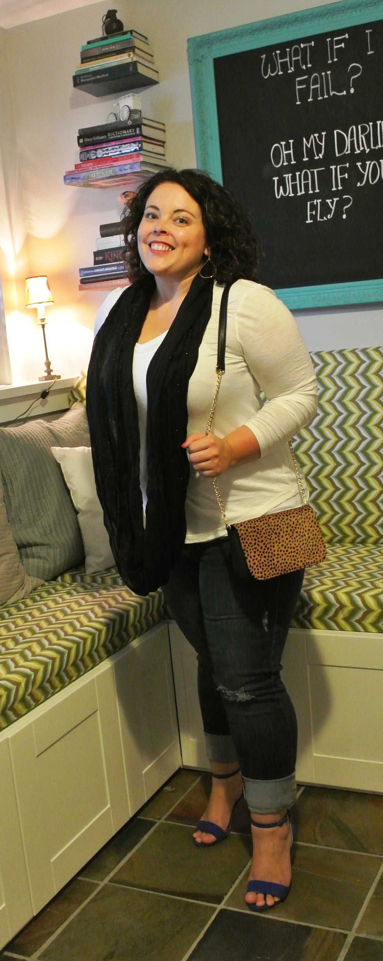#1: Leopard shoulder bag with gold chain from Le Chateau & sparkly circle scarf.