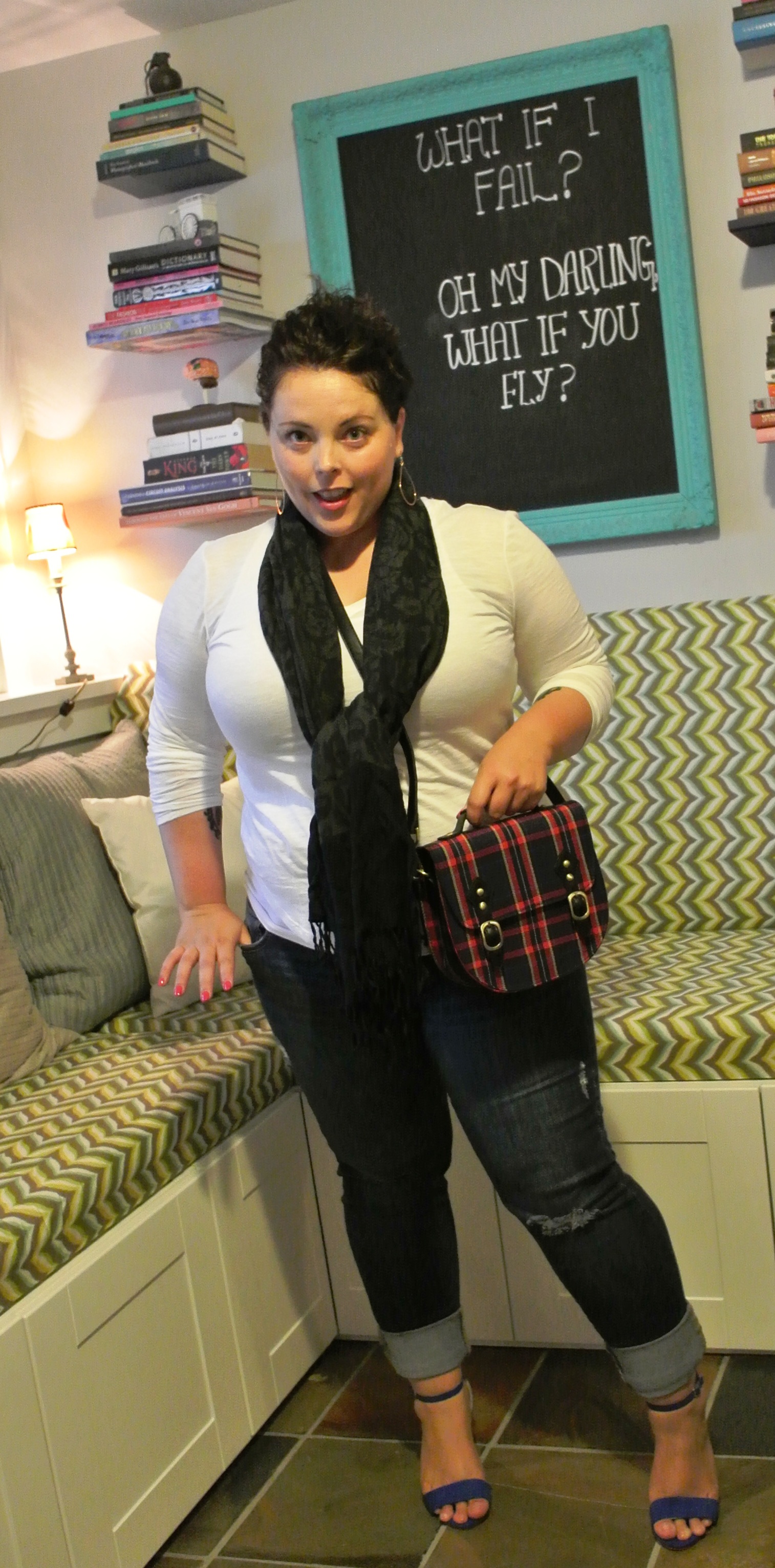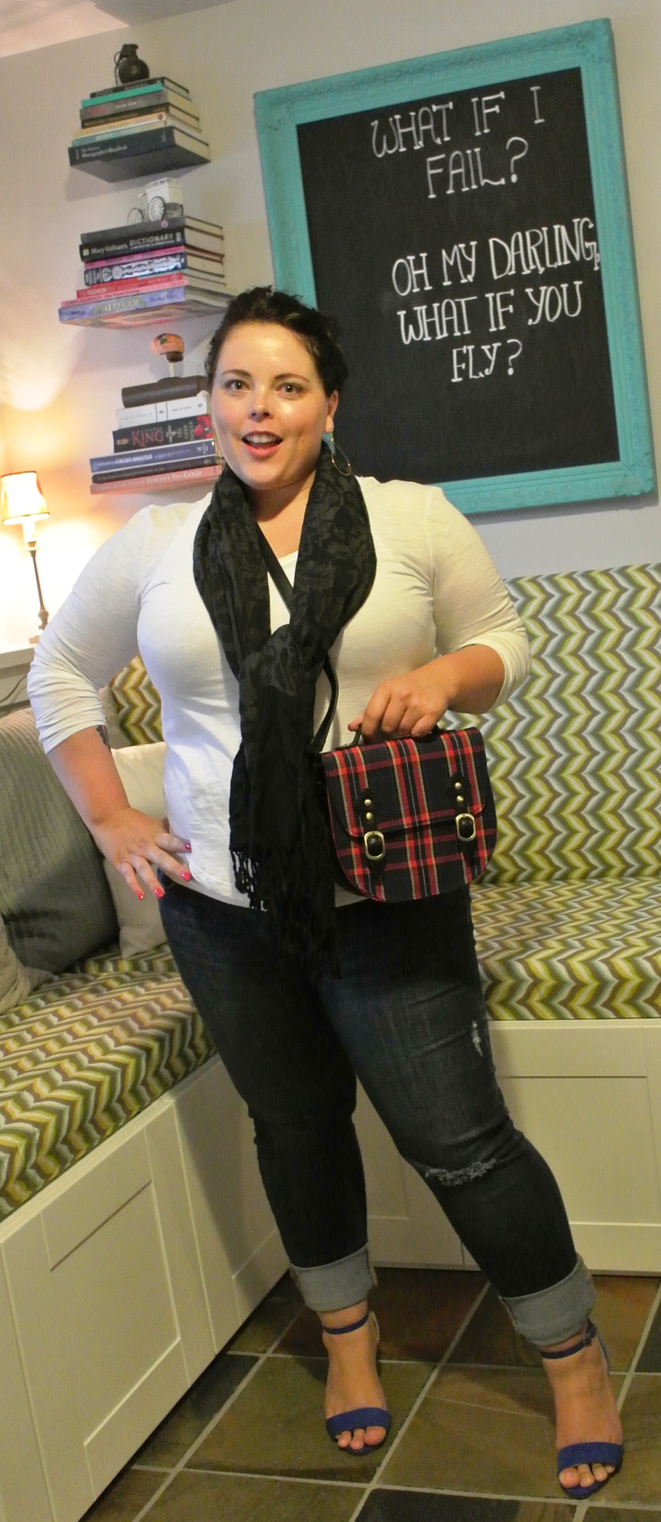 #2: Plaid cross-body saddle bag (has straps to become a backpack) from Plum and black floral scarf.