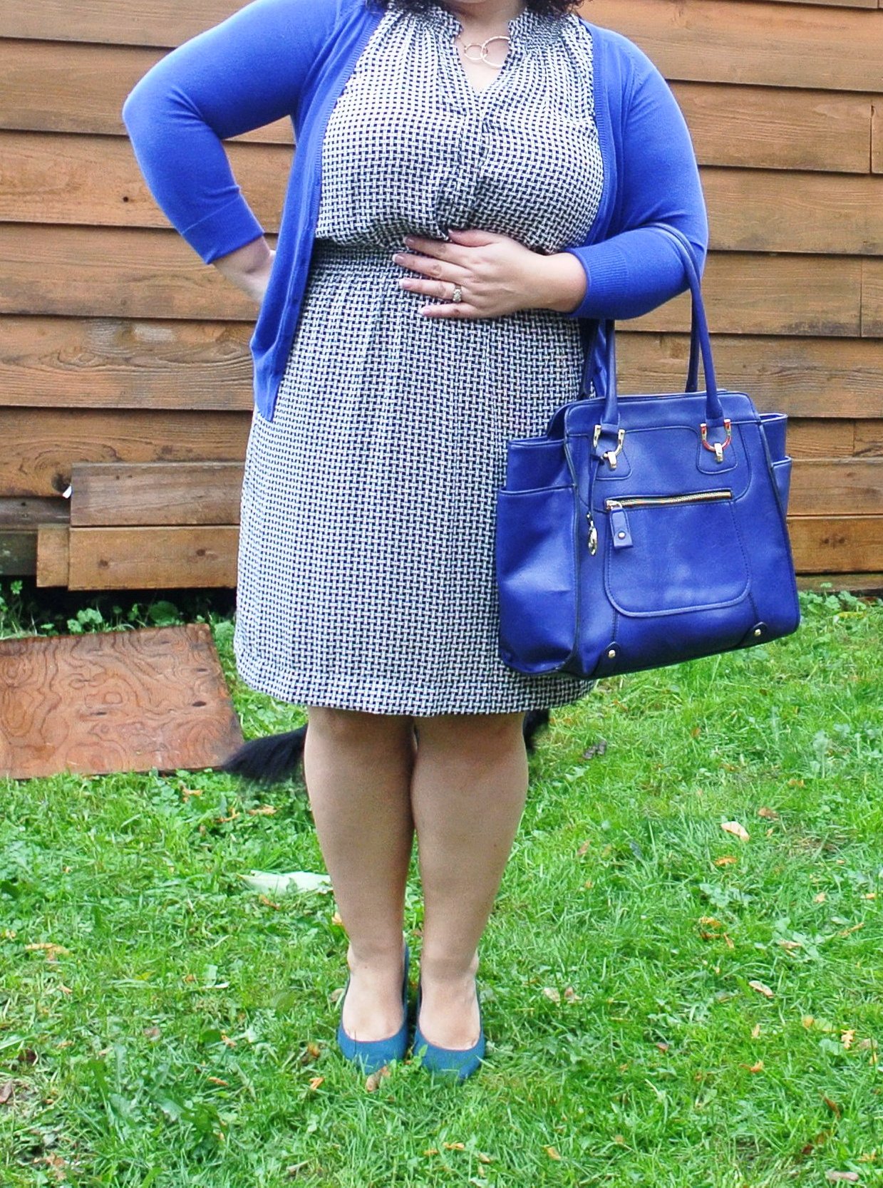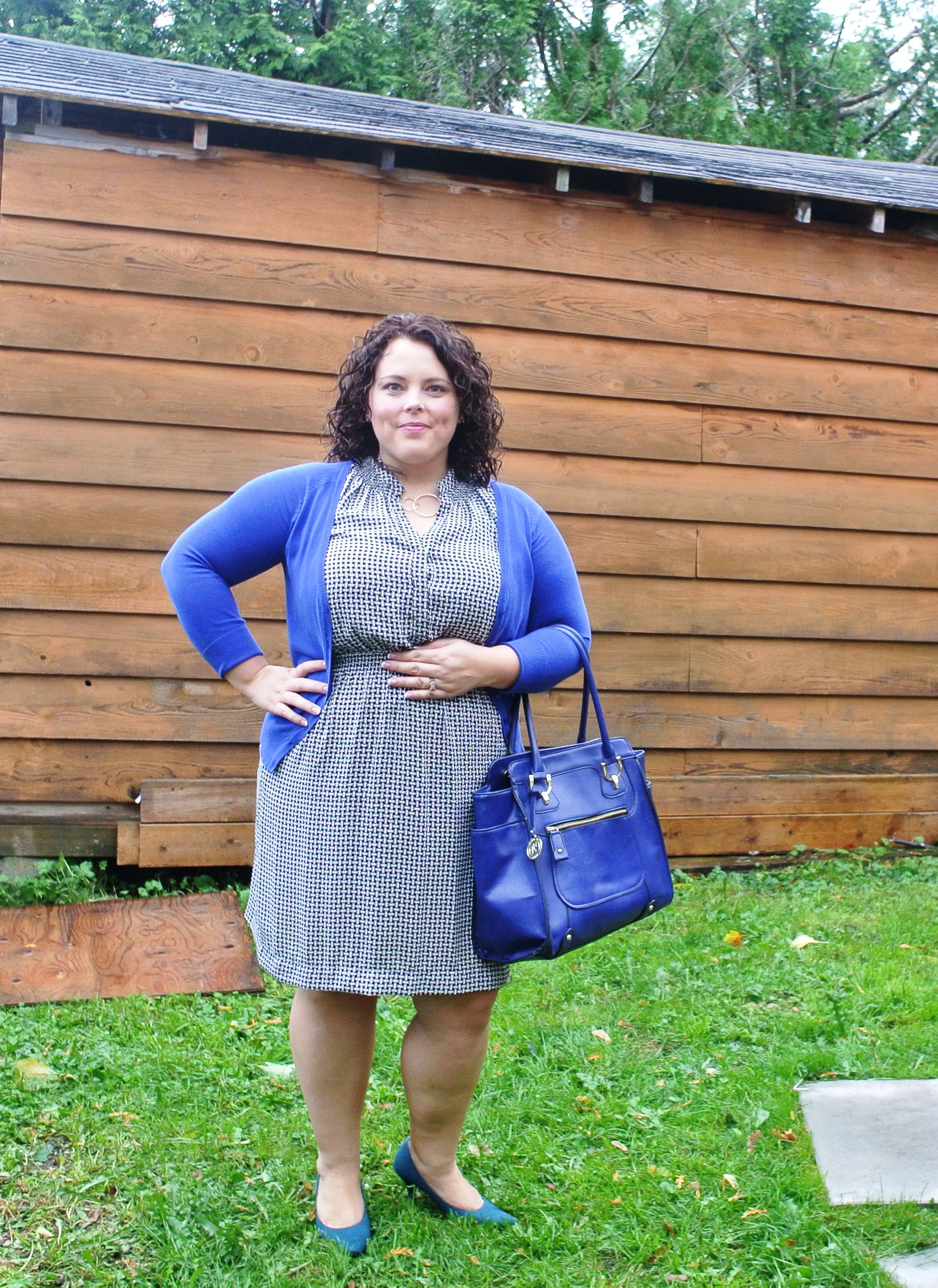 Cardigan: Zara / Dress: Joe Fresh / Necklace: Plum / Bag: Winners / Shoes: Payless