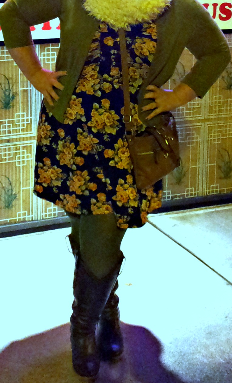 Cardigan: Eddie Bauer / Dress: Thrifted / Scarf: Forever 21 (also available in black and dusty pink) / Crossbody Bag: Aldo (Now on sale!) / Tights: welovecolors.com / Boots: Duo