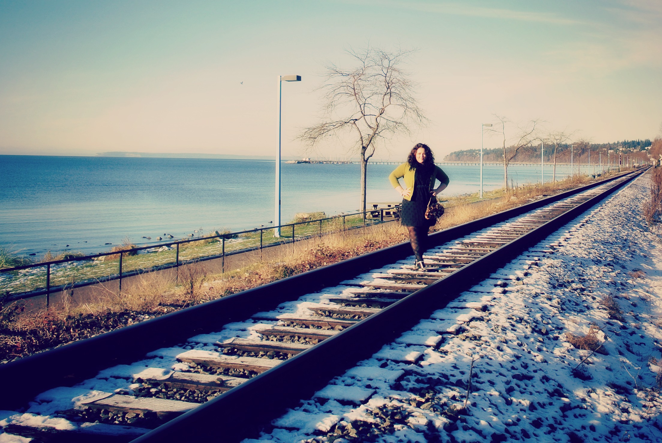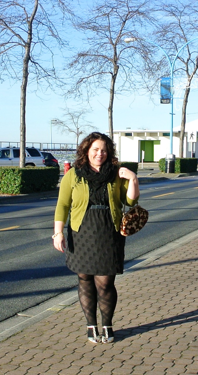 Dress: Gap Factory / Cardigan: Eddie Bauer / Scarf: Chapters / Belt: Etsy / Bracelet: Stella and Dot (on sale!) / Handbag: Vintage / Tights: old / Shoes: Seychelles from Anthropologie