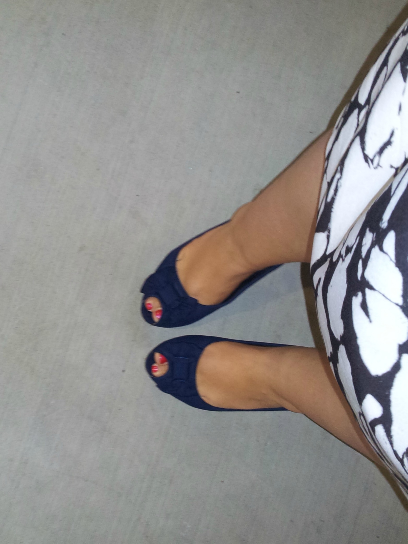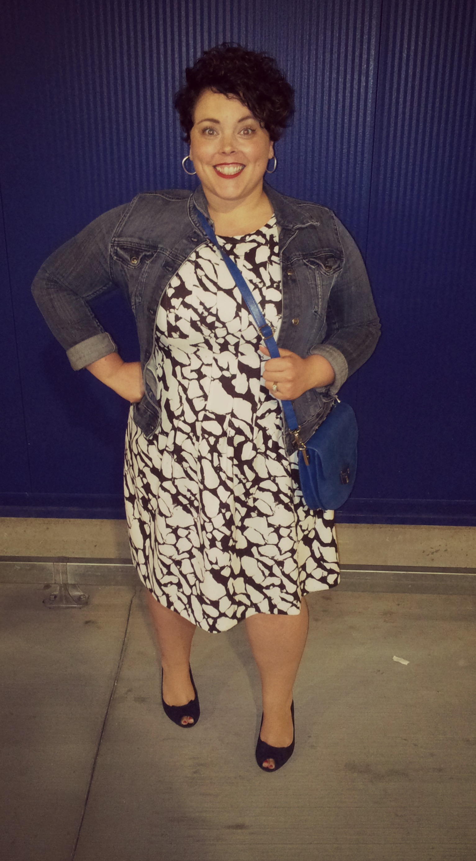 These pics are from last night: Jeff and I went to Ikea to eat meatballs and shop deck tiles. I pulled out this frock that I bought with a gift certificate after Christmas and haven’t worn yet: the dark colour is actually brown, and it kind of looks like flintstone rocks I think. I love it! The shoes are from a store that was having a moving sale near my house a few years ago, and I don’t know why I barely wear them because they’re wonderful. Bows, blue, kitten heel? Just fantastic! I’ll have to remember them more often.