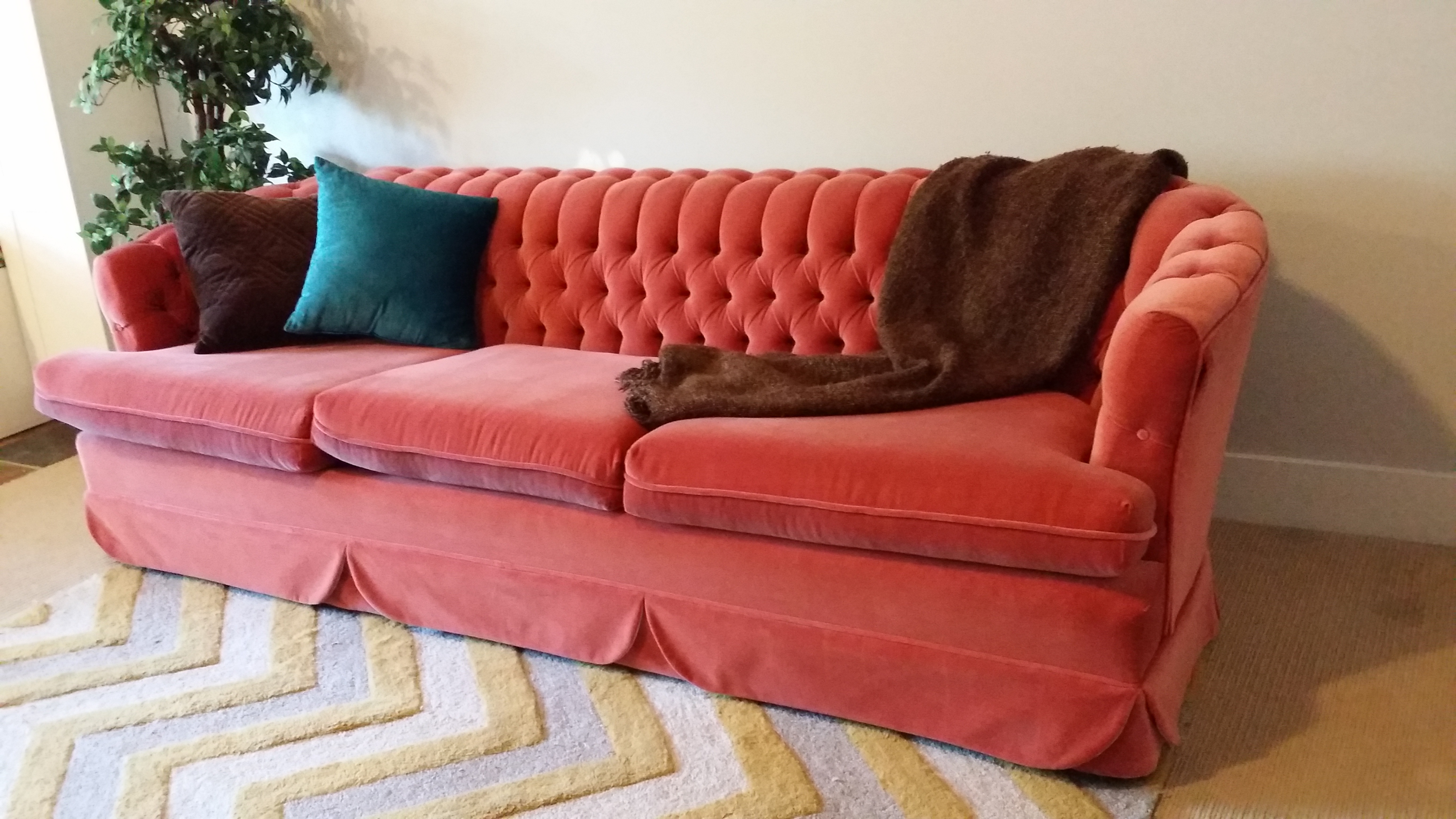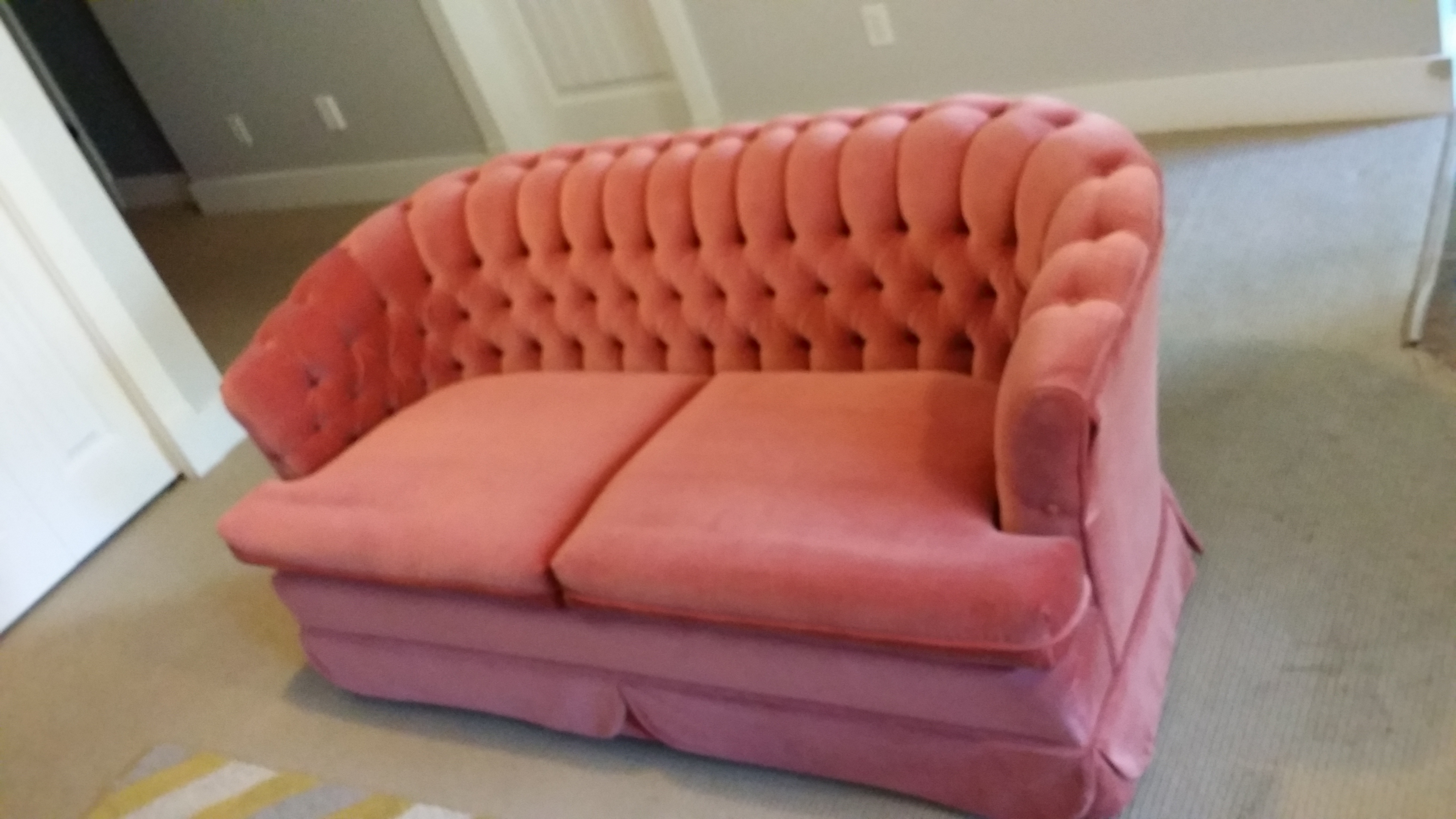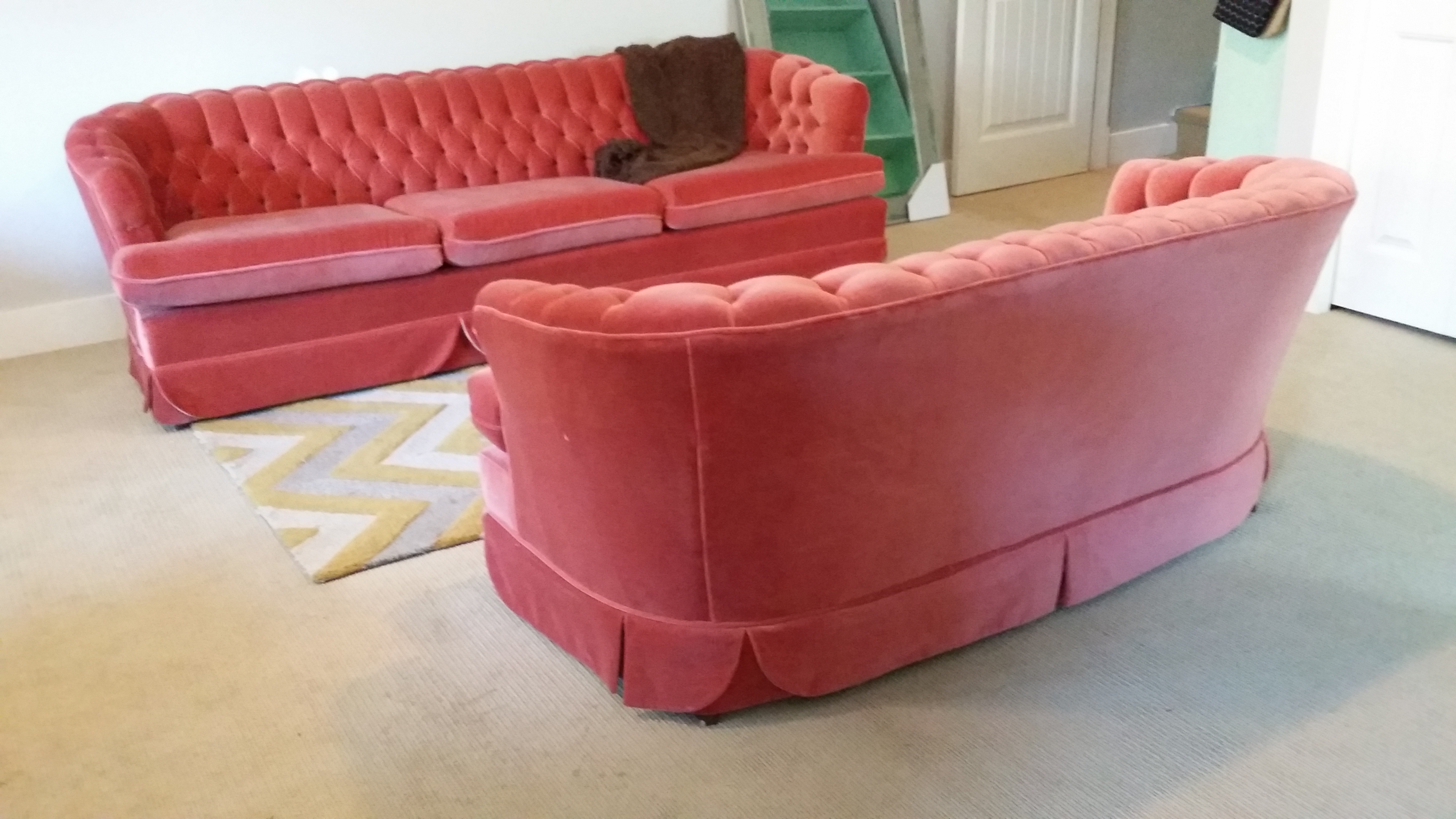 Beautiful and AMAZINGLY comfortable couch set selling for $750 for both.  This set is bright, tufted velvet and can seat 5 or more people.  If you’re looking for something vintage for your living room: this is it!  The price is very good for these pieces, and I will consider all offers as well.