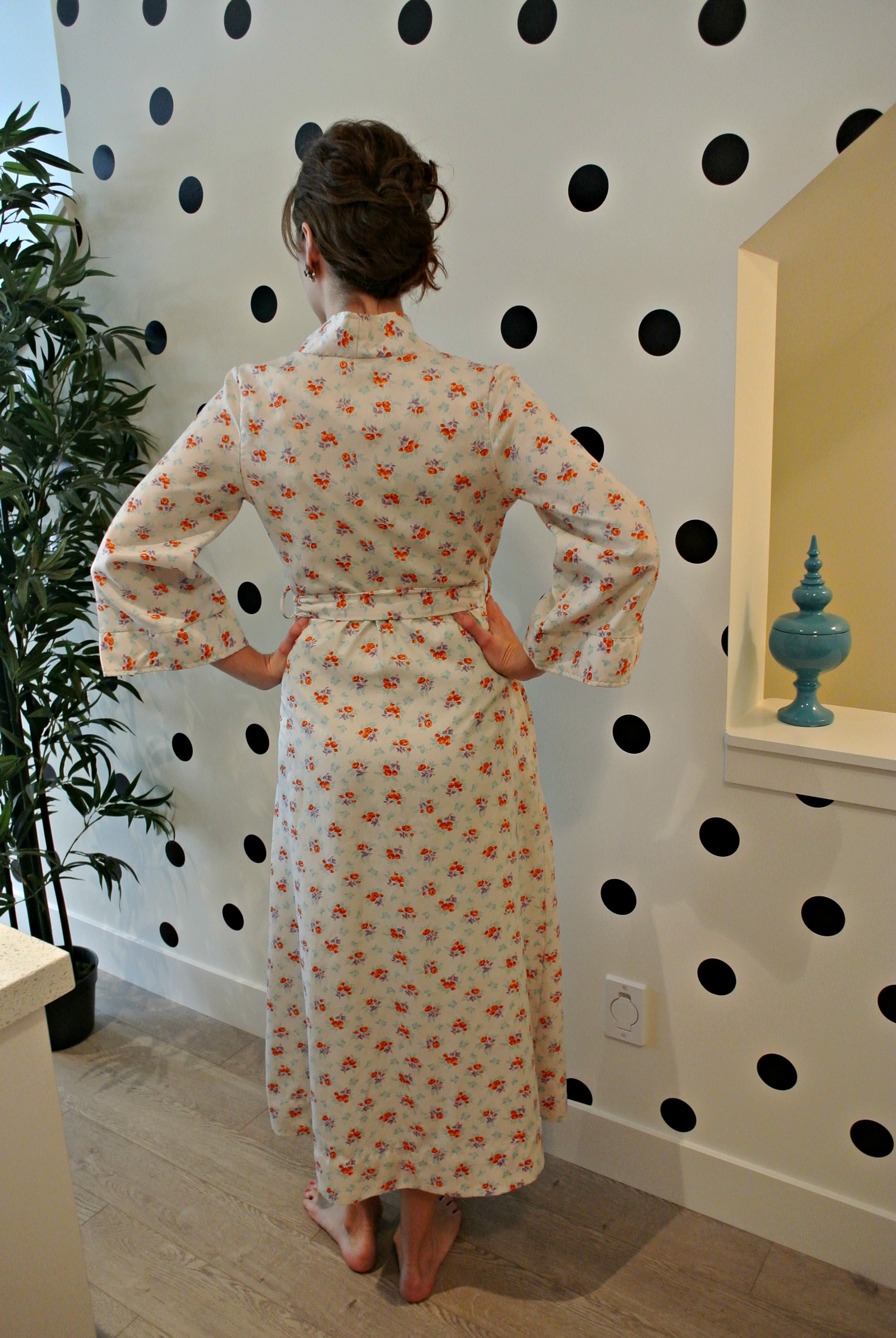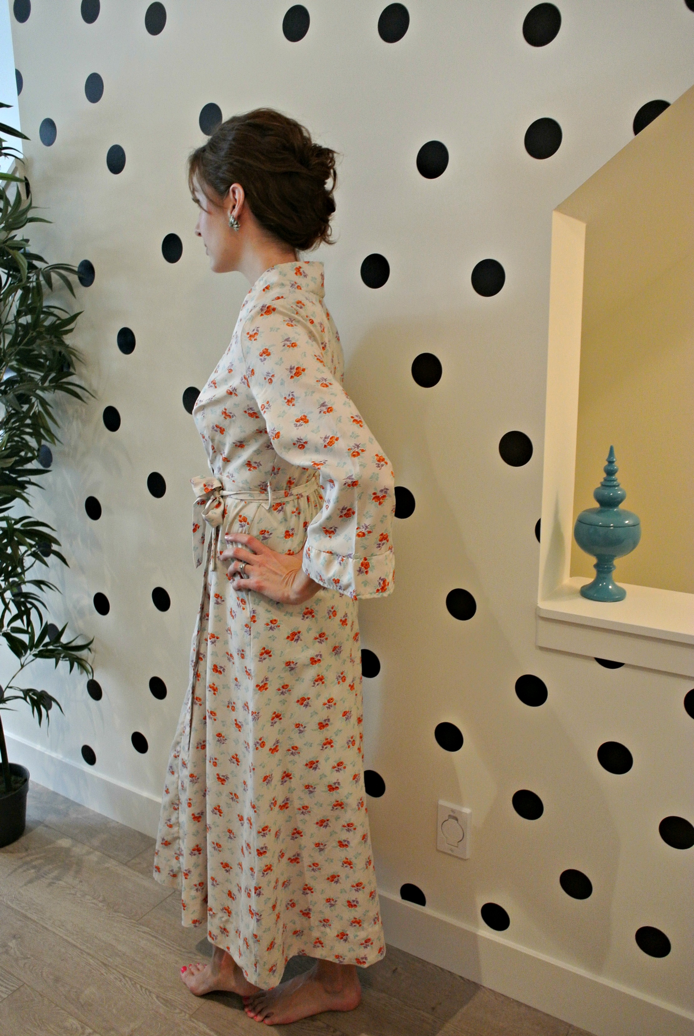 6) tiny floral dressing gown, 70s does 40s size 6-12.  Perfect for a boudoir shoot with a vintage slip, as well as wearing around the house!  Deeta Von Teese says we should be glamorous everywhere, including at home.  With this dressing gown, glamour is easy AND comfy!
