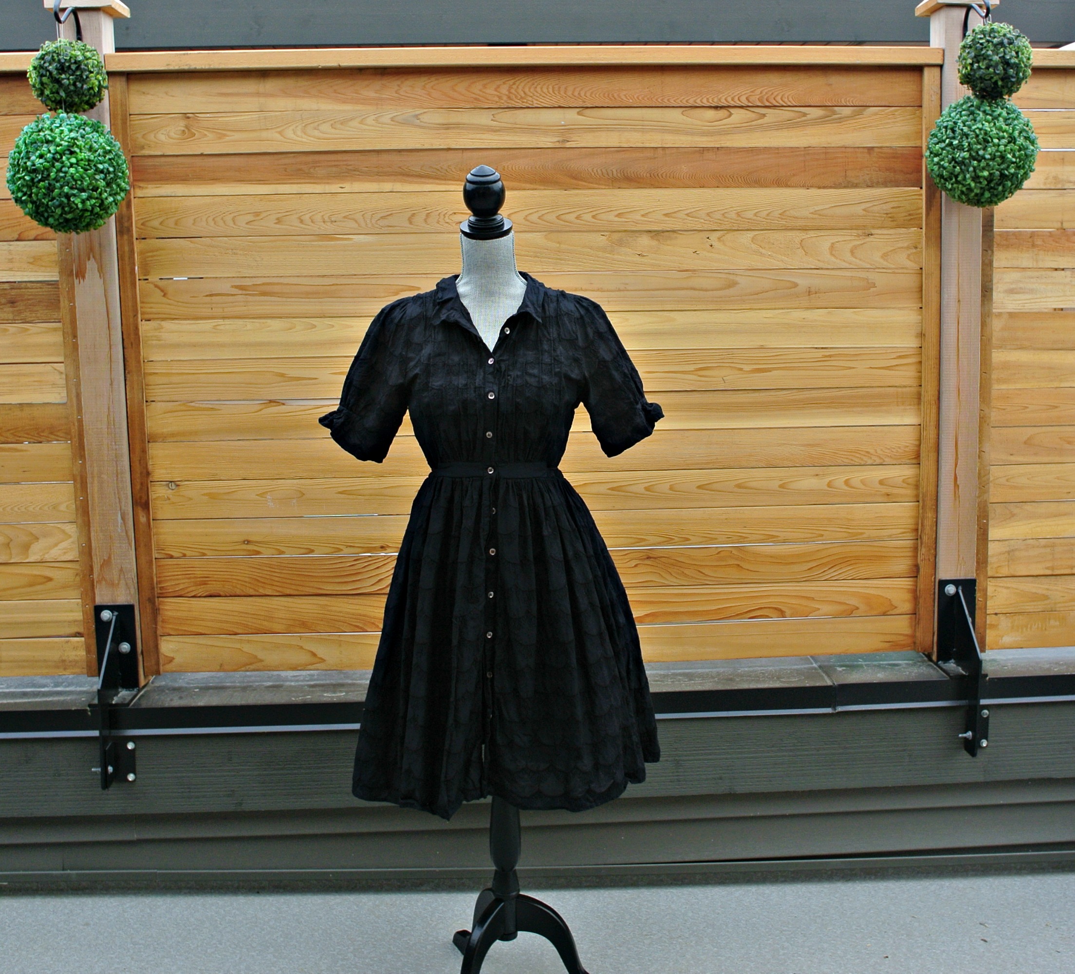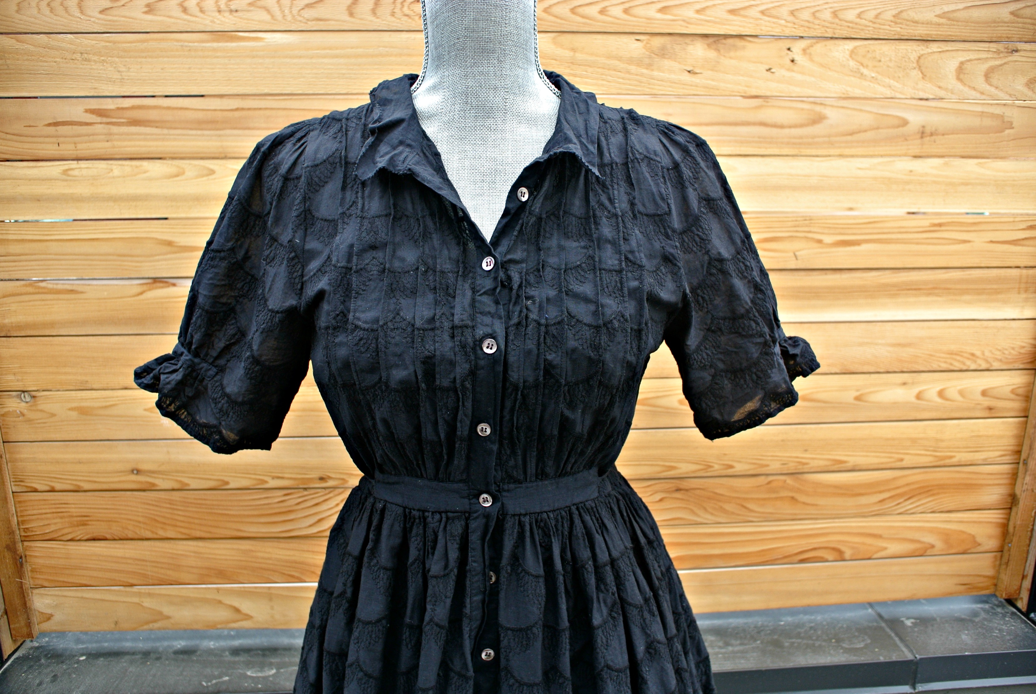4) SOLD Black anthropologie fit and flare shirtdress with embroidery detail, attached tie belt, gathered short sleeves, attached slip.  I have seen this dress worn by actresses in a sitcoms; it’s a good one!  Never been worn (washed once) and purchased for $110