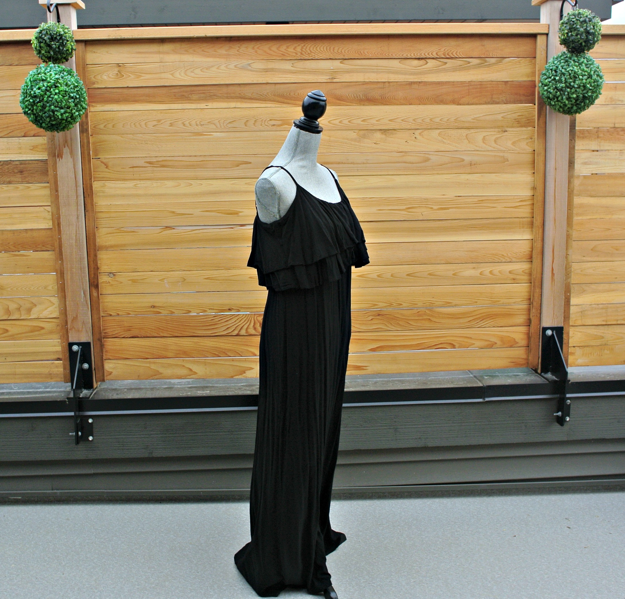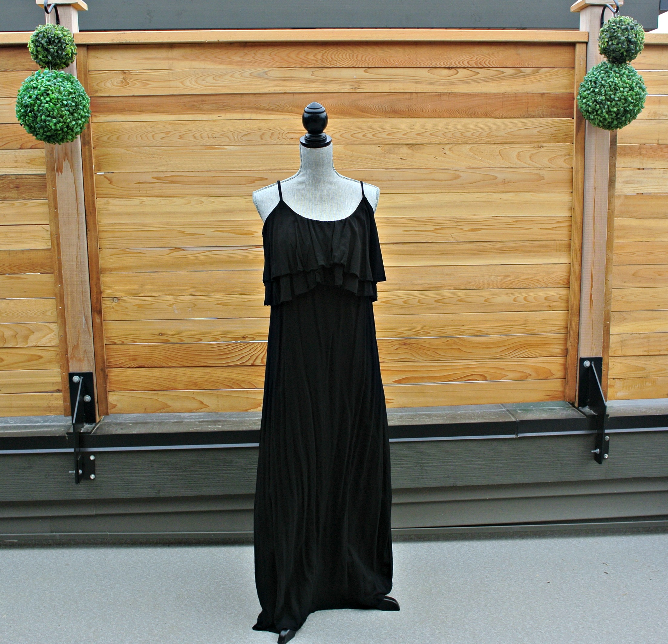 18) SOLD black flutter maxi dress with spaghetti straps: great bohemian vibe with flat sandals and bangles.  Purchased in Munich and worn once.