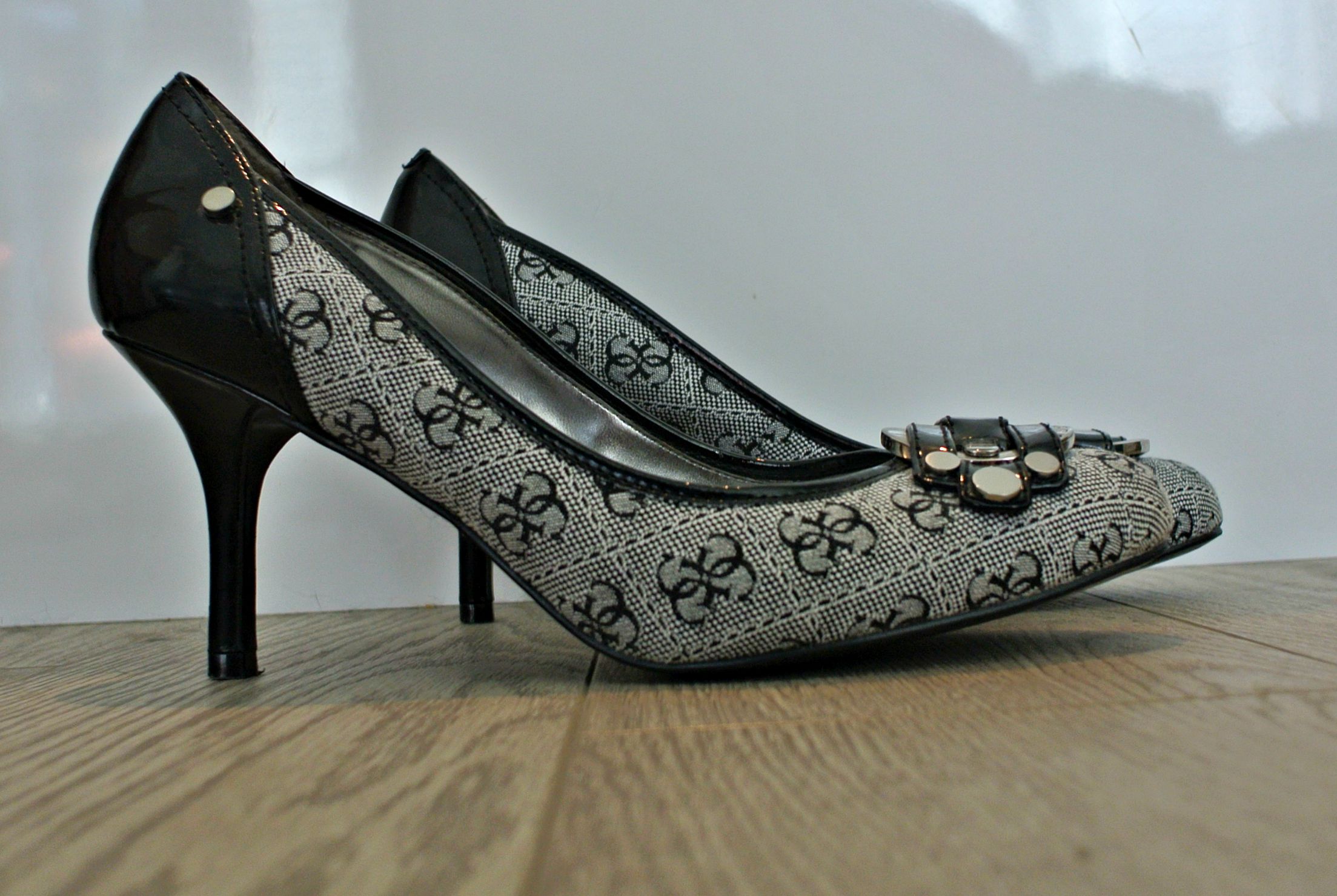 8. Black and white fabric guess heels with black patent heels and toe buckle. size 8.5